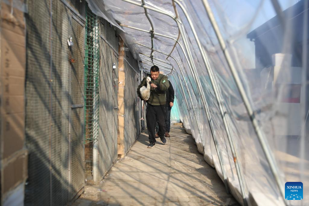 Wang Weiyan, head of Shenyang Raptor Rescue Center, checks the condition of an oriental white stork in Shenyang, northeast China's Liaoning Province, Jan. 5, 2024. (Xinhua/Yang Qing)