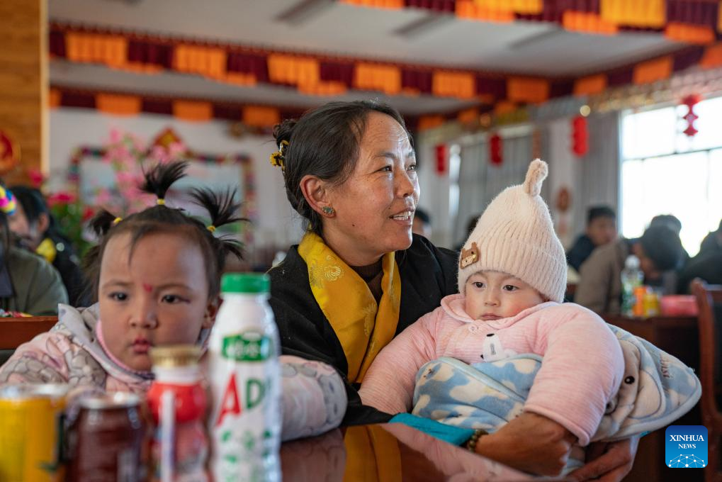 Pasang feeds a baby at a welfare house in Xigaze, southwest China's Xizang Autonomous Region, Jan. 8, 2024. (Photo by Tenzin Nyida/Xinhua)