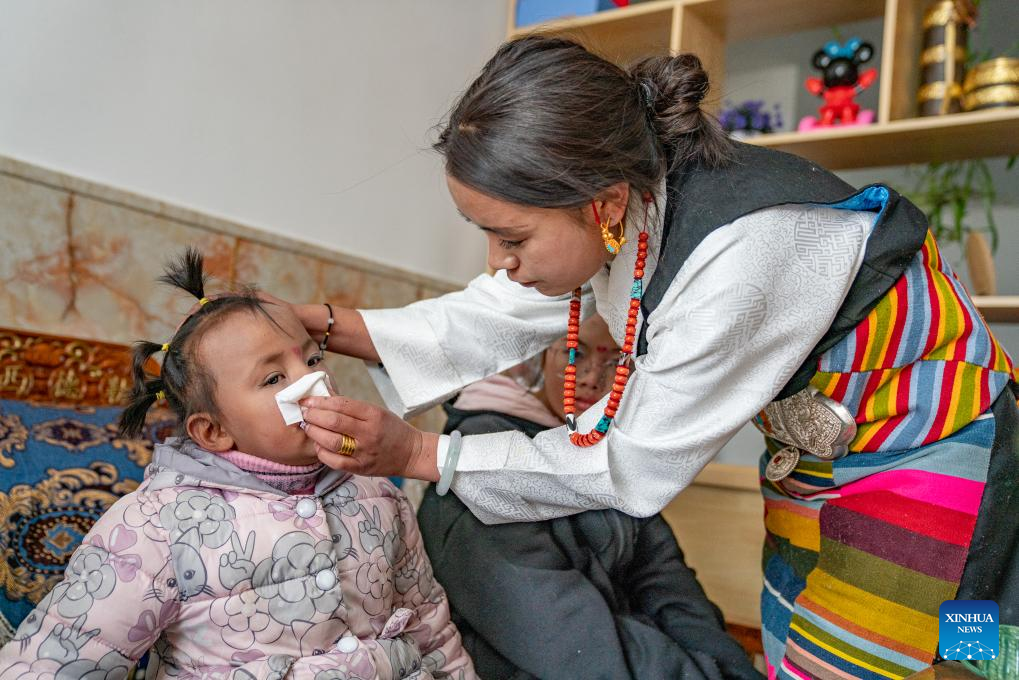 Tenzin Drolma takes care of a child at a welfare house in Xigaze, southwest China's Xizang Autonomous Region, Jan. 8, 2024. (Photo by Tenzin Nyida/Xinhua)