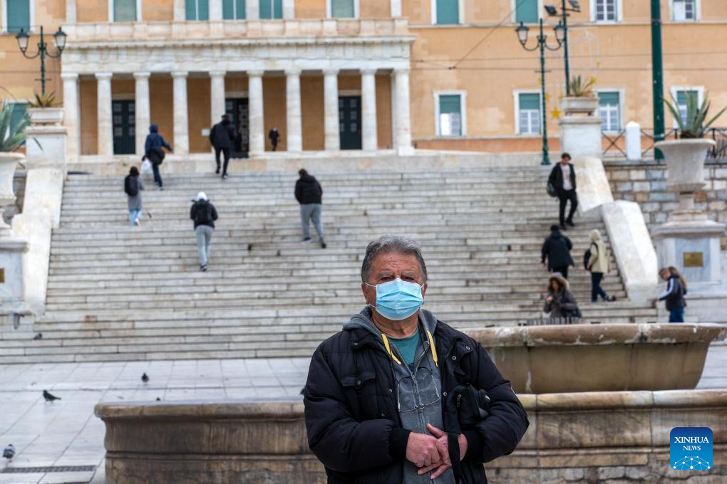 A man wearing a face mask is seen in Athens, Greece, on Jan. 10, 2024. Greek government urged further increase in vaccination rates against COVID-19 and influenza on Wednesday, amid a surge of infections in recent weeks. (Xinhua/Marios Lolos)