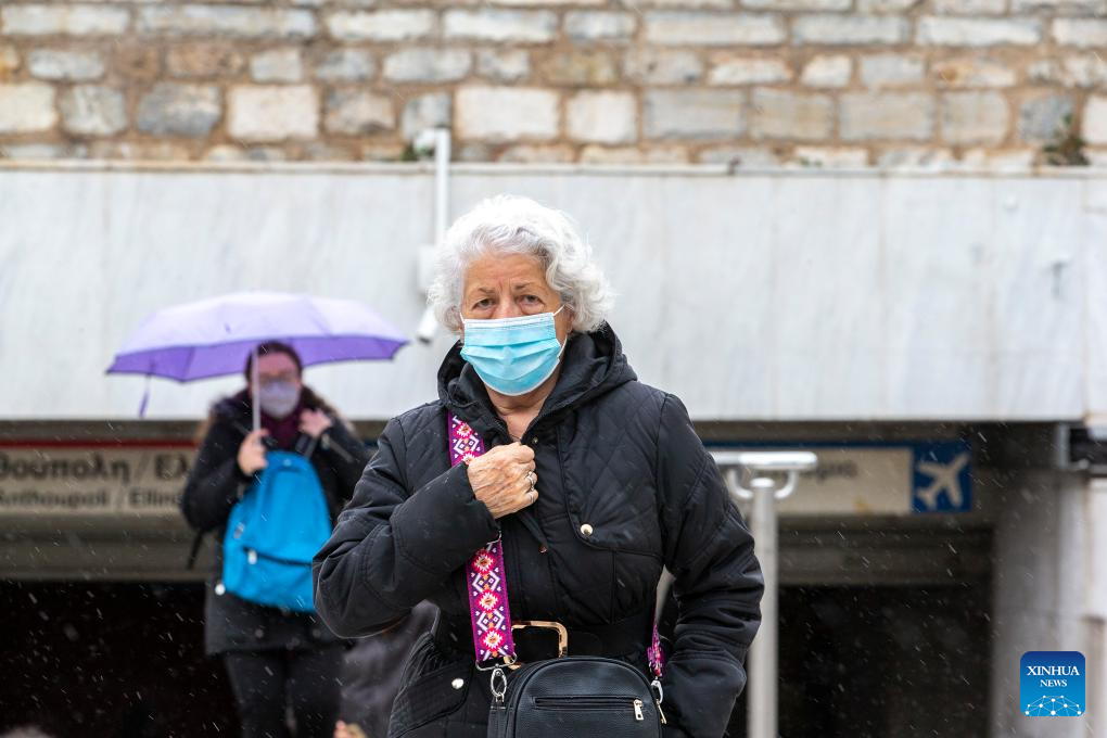 A woman wearing a face mask is seen in Athens, Greece, on Jan. 10, 2024. Greek government urged further increase in vaccination rates against COVID-19 and influenza on Wednesday, amid a surge of infections in recent weeks. (Xinhua/Marios Lolos)