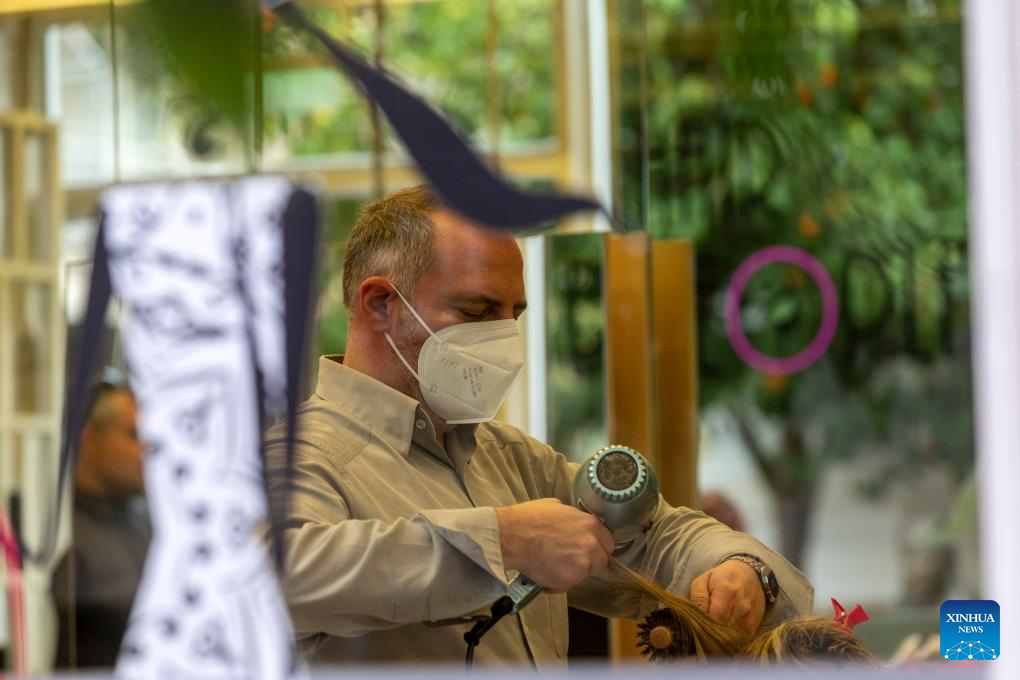 A hairdresser wearing a face mask works in Athens, Greece, on Jan. 10, 2024. Greek government urged further increase in vaccination rates against COVID-19 and influenza on Wednesday, amid a surge of infections in recent weeks. (Xinhua/Marios Lolos)