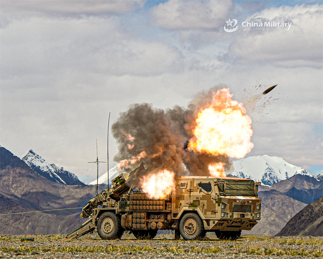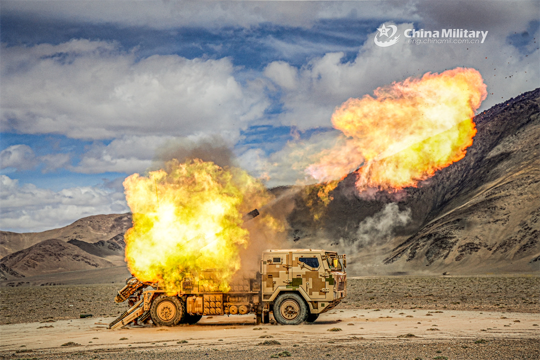 A vehicle-mounted howitzer attached to an artillery element of the army under the Chinese PLA Xinjiang Military Command fires at mock targets in a day and night live-fire training exercise on December 26, 2023. (eng.chinamil.com.cn/Photo by Duan Jie)