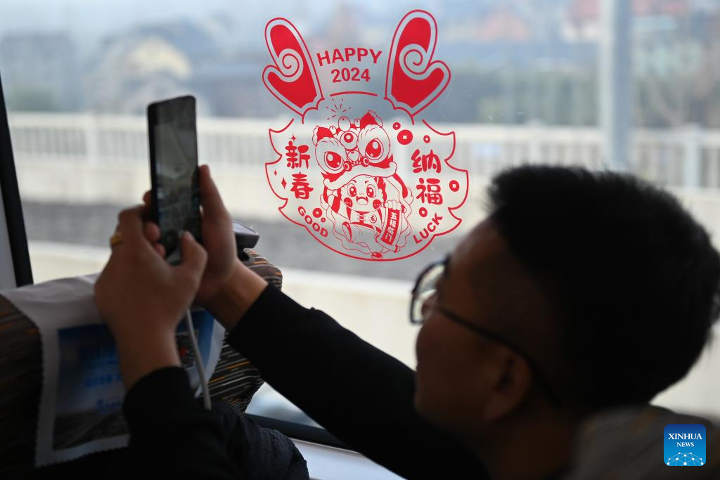 A passenger sits in a bullet train heading directly for Guangzhou East Railway Station in south China's Guangdong Province from Hangzhou West Railway Station in Hangzhou City of east China's Zhejiang Province, Jan. 10, 2024. A new passenger train service directly linking Hangzhou West Railway Station in Hangzhou and Guangzhou East Railway Station in Guangzhou was launched on Wednesday. China started to implement a new railway operating plan on the same day. (Xinhua/Huang Zongzhi)