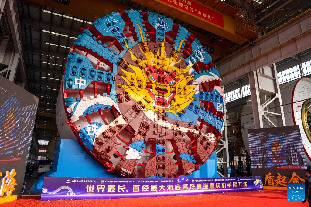 The tunnel boring machine (TNM) Dinghai is seen at an industrial park of China Railway Construction Heavy Industry Corporation Limited in Changsha, central China's Hunan Province, Jan. 10, 2024. With a diameter of 14.57 meters and a total weight of 4,350 tonnes, the TNM Dinghai will be used in the construction of Jintang undersea tunnel linking the Jintang islet of Zhoushan and the coastal area of Ningbo. (Xinhua/Chen Sihan)