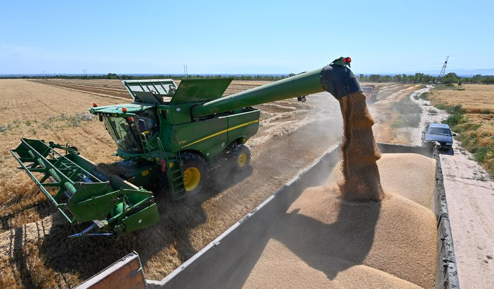 Wheat grains are loaded onto a truck in Hutubi county, northwest China's Xinjiang Uygur Autonomous Region, July 15, 2023. [Photo/Xinhua]