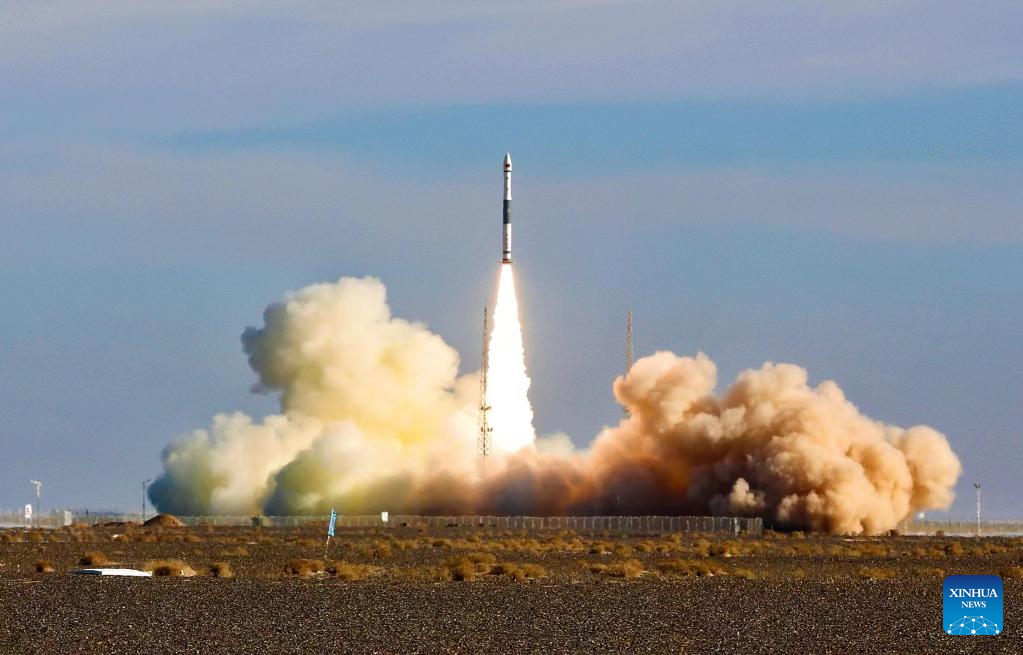 A Kuaizhou-1A carrier rocket carrying the Tianxing-1 02 satellite blasts off from the Jiuquan Satellite Launch Center in northwest China, Jan. 11, 2024. The satellite, mainly used for experiments such as space environment detection, was launched at 11:52 a.m. (Beijing Time) and has entered the planned orbit. (Photo by Yang Xiaobo/Xinhua)