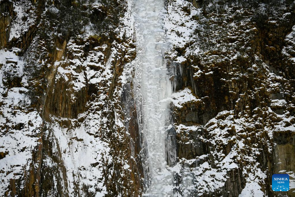 This photo taken on Jan. 10, 2024 shows a view of Hailuogou scenic area in Garze Tibetan Autonomous Prefecture, southwest China's Sichuan Province. Hailuogou scenic area reopened to visitors on Dec. 12, 2023 with newly-built and upgraded infrastructure, over a year after a 6.8-magnitude earthquake forced its closure. (Xinhua/Xu Bingjie)
