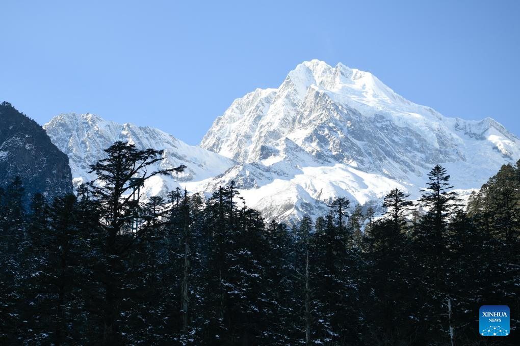 This photo taken on Jan. 10, 2024 shows a view of Mount Gongga glacier seen from Hailuogou scenic area in Garze Tibetan Autonomous Prefecture, southwest China's Sichuan Province. Hailuogou scenic area reopened to visitors on Dec. 12, 2023 with newly-built and upgraded infrastructure, over a year after a 6.8-magnitude earthquake forced its closure. (Xinhua/Xu Bingjie)