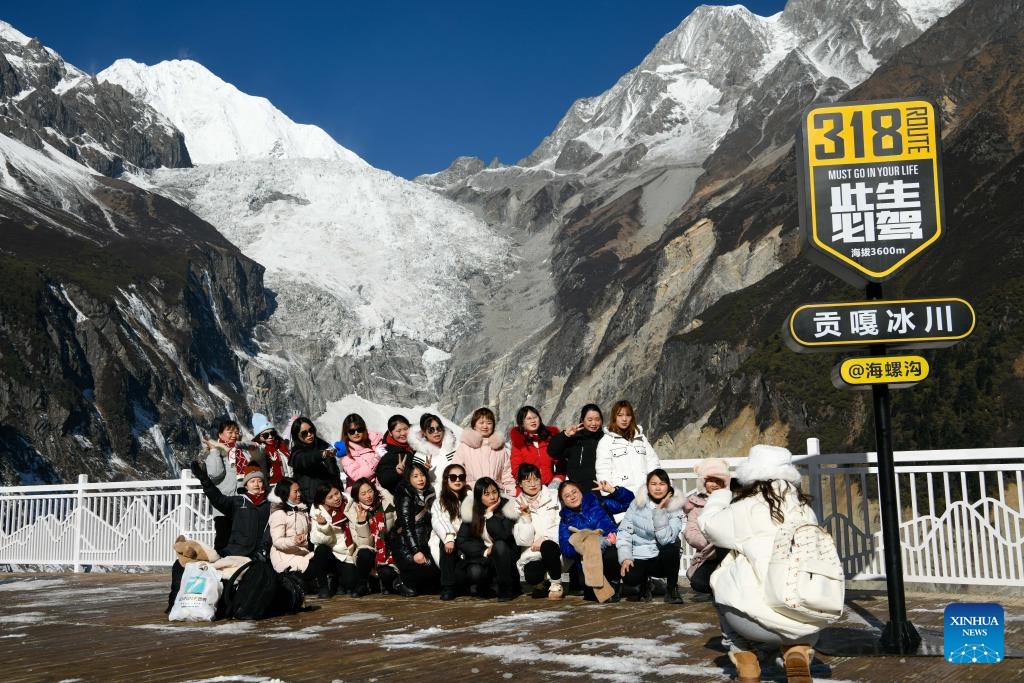 Visitors take a group photo with Mount Gongga in the background at Hailuogou scenic area in Garze Tibetan Autonomous Prefecture, southwest China's Sichuan Province, Jan. 10, 2024. Hailuogou scenic area reopened to visitors on Dec. 12, 2023 with newly-built and upgraded infrastructure, over a year after a 6.8-magnitude earthquake forced its closure. (Xinhua/Xu Bingjie)