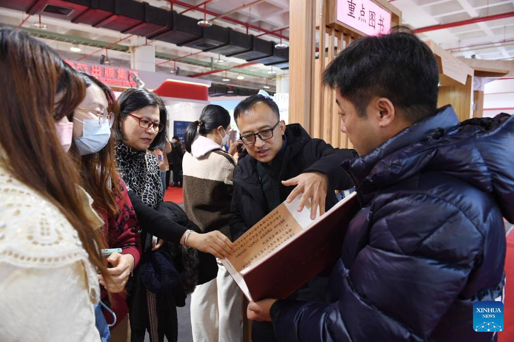 An exhibitor (2nd R) introduces a book at 2024 Beijing Book Fair in Beijing, capital of China, Jan. 11, 2024. More than 720 exhibitors participated in the 2024 Beijing Book Fair which started on Thursday, showcasing more than 400,000 kinds of books. (Xinhua/Ju Huanzong)