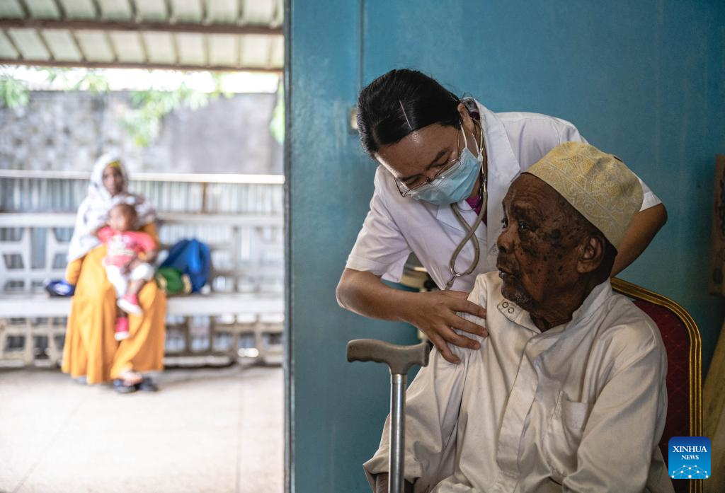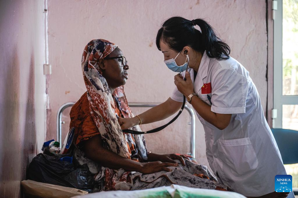 Xu Rongting, a member of the Chinese medical team, examines a patient at the El-Maarouf Hospital in Moroni, capital of the Comoros, Jan. 11, 2024. The medical team from south China's Guangxi Zhuang Autonomous Region arrived in the Comoros in 2022, providing medical services for local patients and training for local doctors. (Xinhua/Wang Guansen)