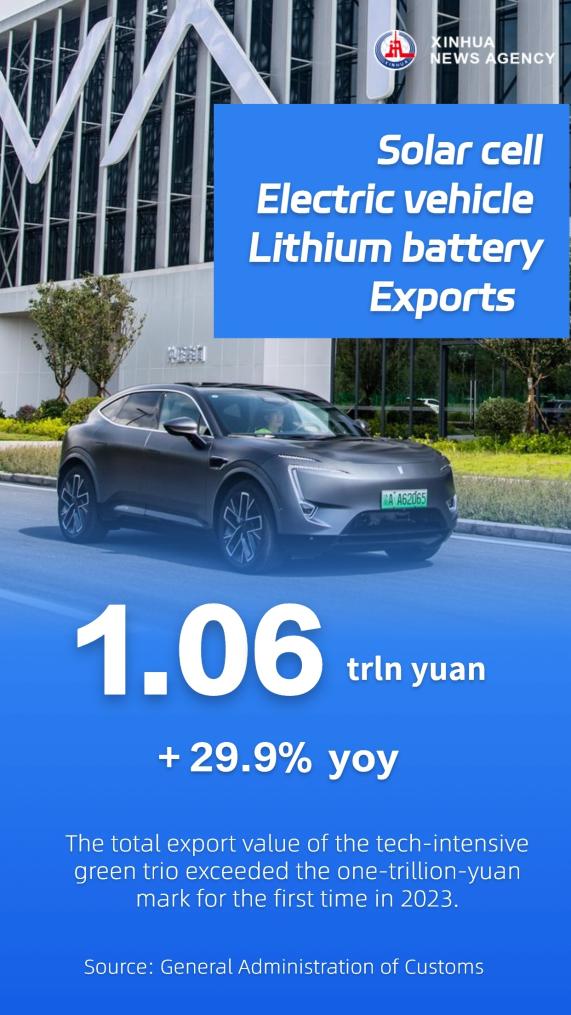 The total export value of China's new tech-intensive green trio, namely solar batteries, lithium-ion batteries and electric vehicles, surged 29.9 percent to 1.06 trillion yuan in 2023, with the figure topping the one-trillion-yuan mark for the first time.
