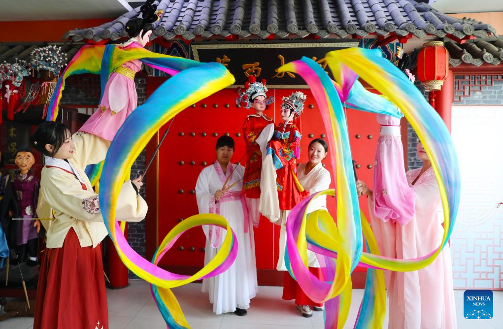 Artists of a puppet troupe practice in Laixi of east China's Shandong Province, Jan. 14, 2024. (Photo by Zhang Jingang/Xinhua)
