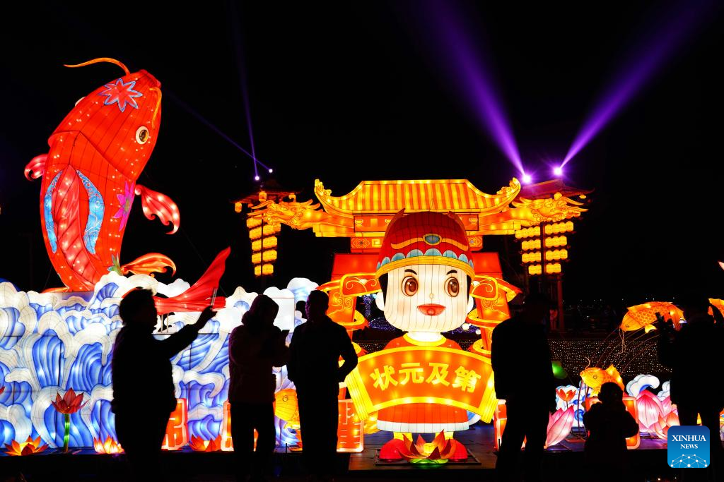 People visit a lantern fair in Caocun Town of Ruian, east China's Zhejiang Province, Jan. 13, 2024. (Photo by Zhuang Yingchang/Xinhua)