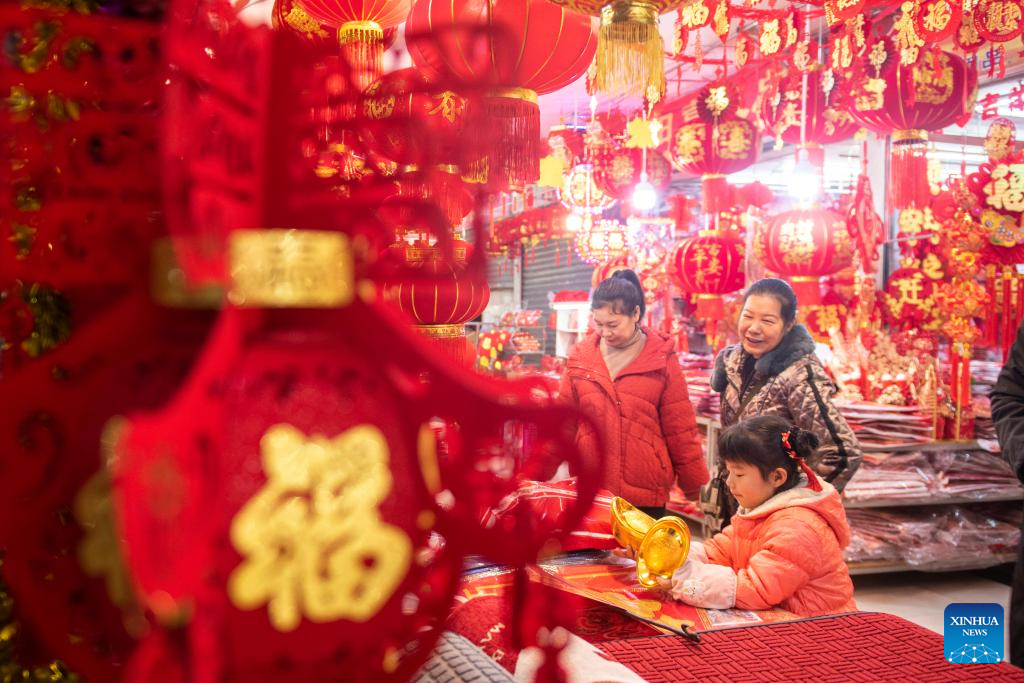 Citizens choose New Year decorations at a wholesale market in Loudi of central China's Hunan Province, Jan. 14, 2024. (Photo by Wu Yonghua/Xinhua)
