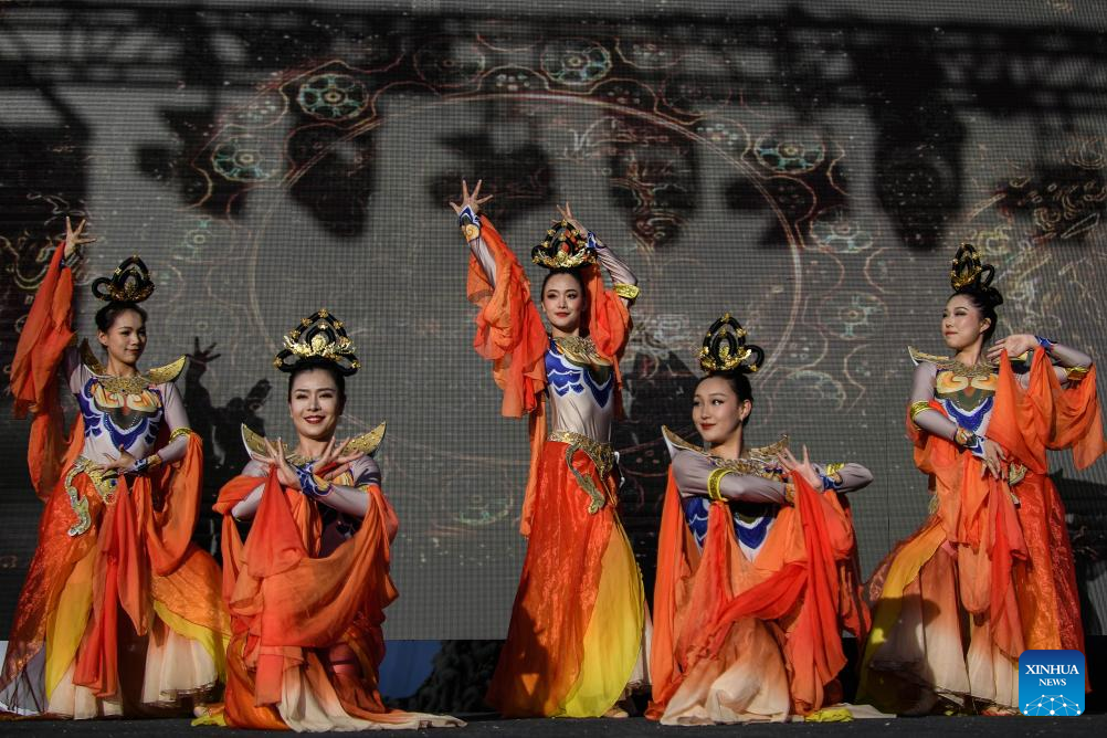 A traditional Chinese dance performance is staged during an event to greet the upcoming Spring Festival in Santiago, Chile, Jan. 13, 2024. (Photo by Jorge Villegas/Xinhua)