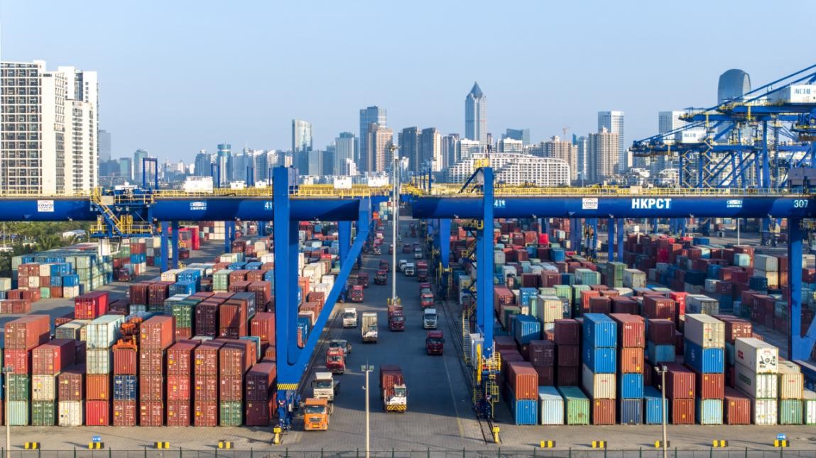 Photo taken on Dec. 8, 2023 shows a busy scene at a container terminal of the Haikou port in Haikou, south China's Hainan province. (People's Daily Online/Yang He)