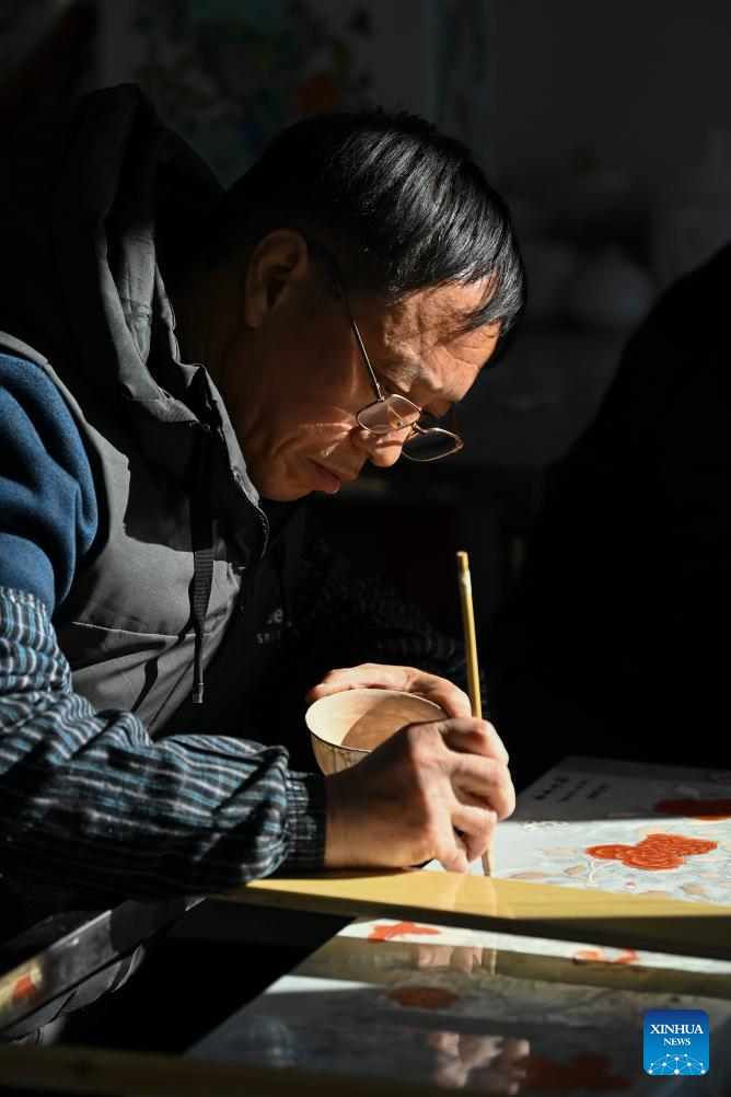 A craftsman paints on a piece of porcelain at a production base of Honglyucai (Red and Green Color) Porcelain in Honglyucai Village, Changzhi City of north China's Shanxi Province, Jan. 4, 2024. (Xinhua/Yang Chenguang)
