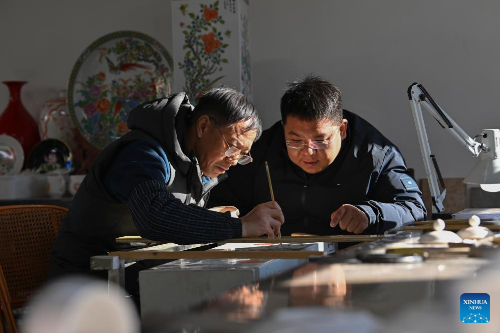 Li Yamin (R) asks for advice from an experienced craftsman at a production base of Honglyucai (Red and Green Color) Porcelain in Honglyucai Village, Changzhi City of north China's Shanxi Province, Jan. 4, 2024.(Xinhua/Yang Chenguang)