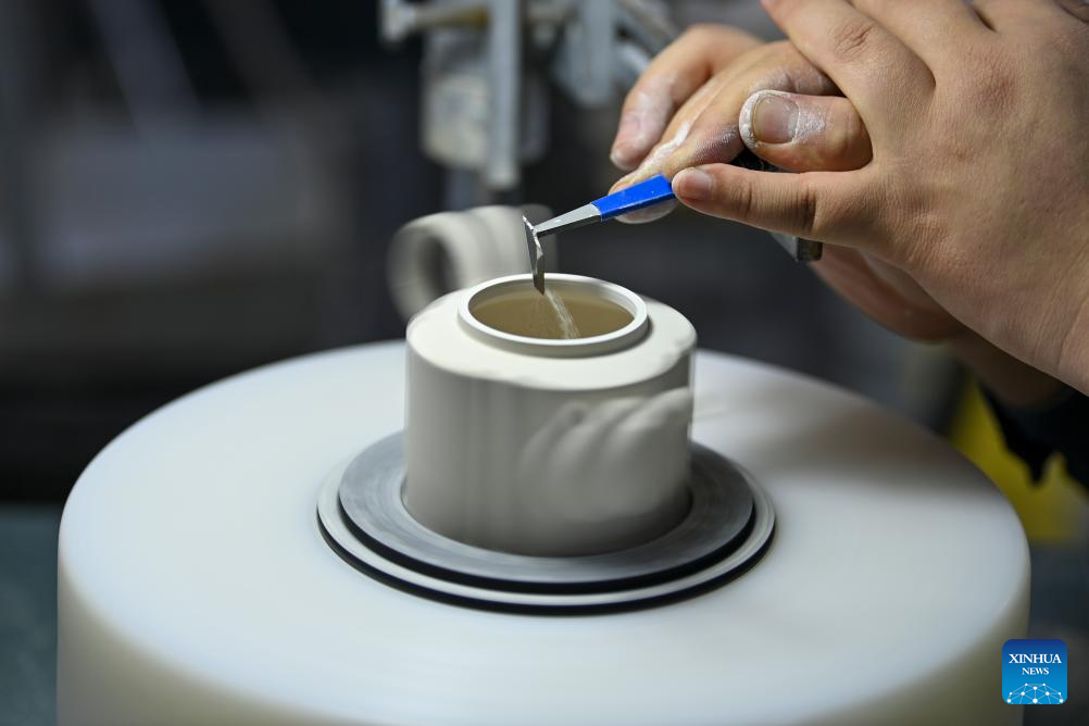 A craftsman fixes a ceramic body at a production base of Honglyucai (Red and Green Color) Porcelain in Honglyucai Village, Changzhi City of north China's Shanxi Province, Jan. 4, 2024.(Xinhua/Yang Chenguang)