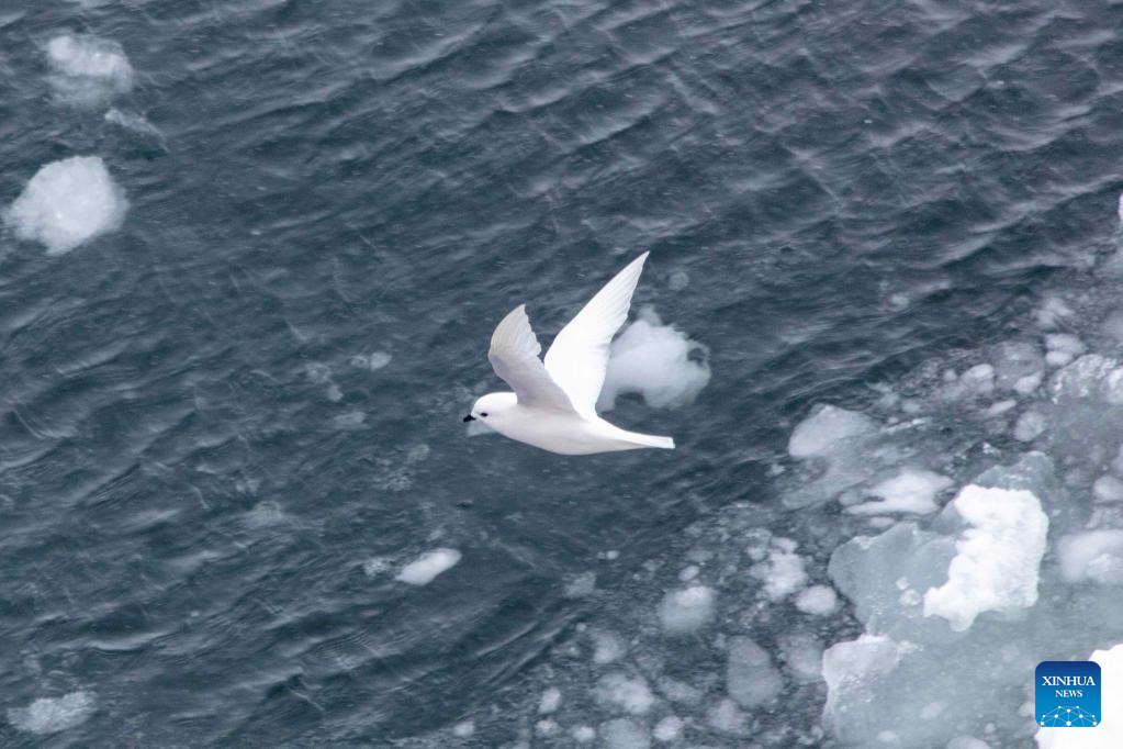 A snow petrel flies above the Amundsen Sea on Jan. 10, 2024. China's research icebreaker Xuelong 2 is conducting an Antarctic expedition in the Amundsen Sea, where various animals can be spotted. (Xinhua/Zhou Yuan)