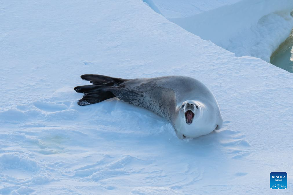 This photo taken on Jan. 8, 2024 shows a seal in the Amundsen Sea. China's research icebreaker Xuelong 2 is conducting an Antarctic expedition in the Amundsen Sea, where various animals can be spotted. (Xinhua/Zhou Yuan)