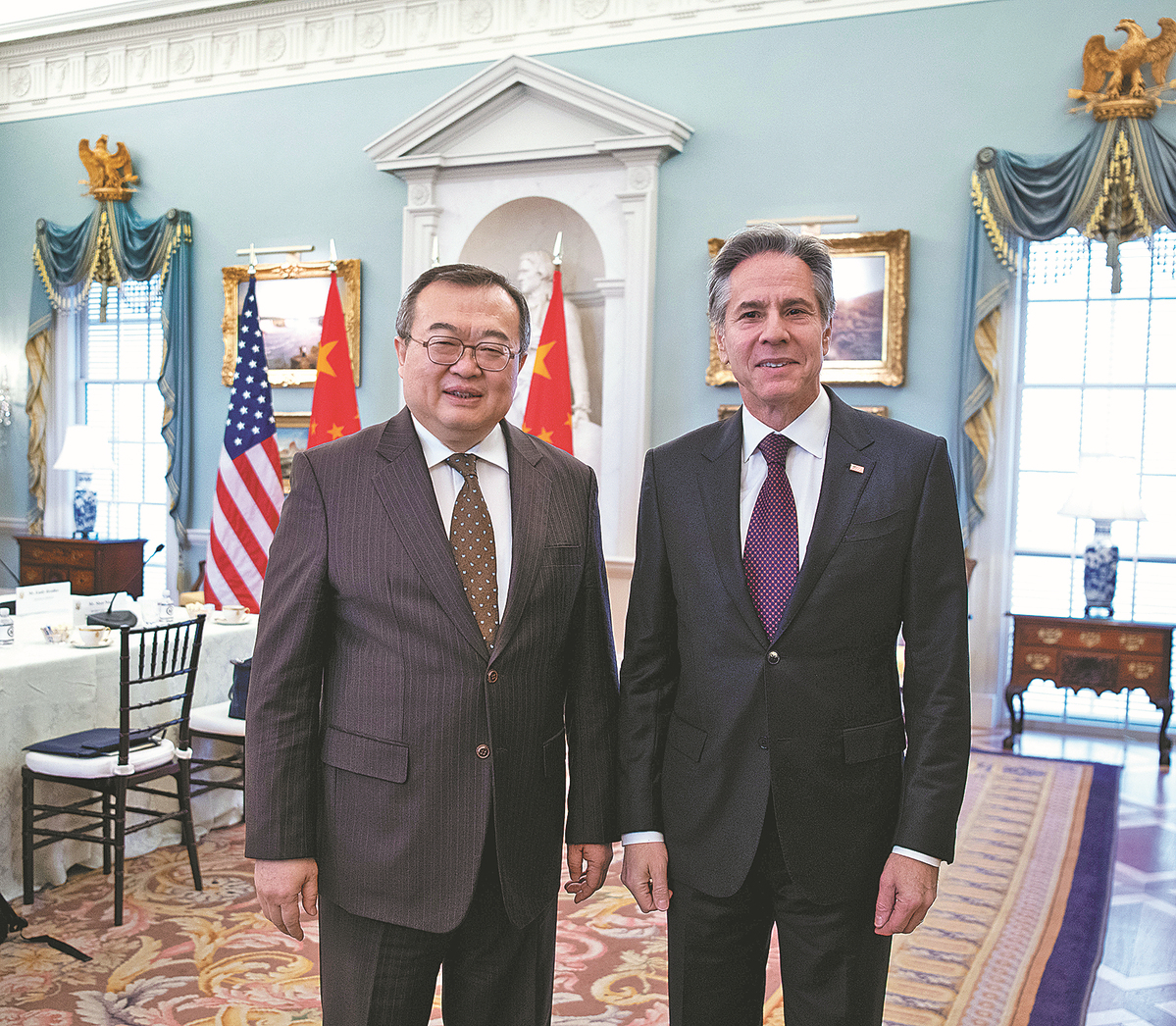 Liu Jianchao, head of the International Department of the Communist Party of China Central Committee, meets with US Secretary of State Antony Blinken in Washington, DC, on Friday. Liu visited the United States from Jan 8 through Saturday. [LIU JIE/XINHUA]
