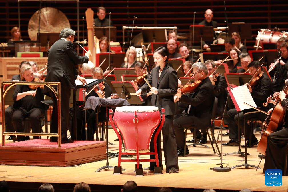 Fu Yifei (C), a percussionist from the Shanghai Symphony Orchestra, performs during a concert presented by the Philadelphia Orchestra to celebrate Chinese New Year in Verizon Hall at the Kimmel Center for the Performing Arts in Philadelphia, the United States, Jan. 12, 2024. (Xinhua/Xie E)