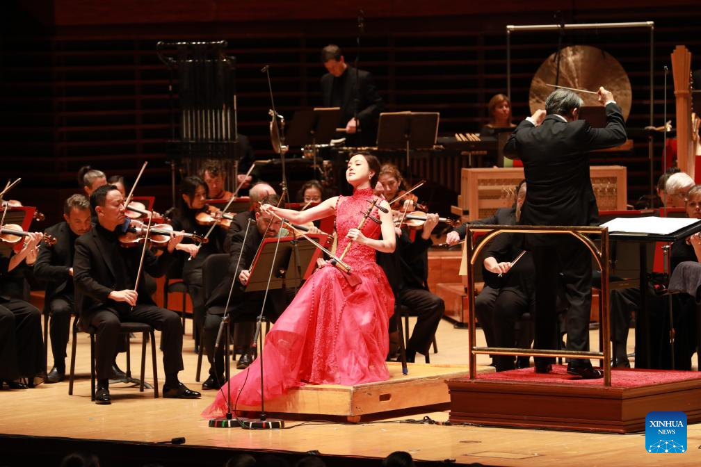 Chinese Huqin (a traditional Chinese string instrument) artist Lu Yiwen (C) performs during a concert presented by the Philadelphia Orchestra to celebrate Chinese New Year in Verizon Hall at the Kimmel Center for the Performing Arts in Philadelphia, the United States, Jan. 12, 2024. (Xinhua/Xie E)
