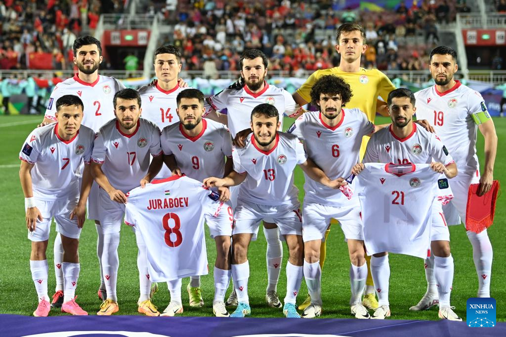 The line-up players of Tajikistan pose for photo prior to the Group A match between China and Tajikistan at AFC Asian Cup in Doha, Qatar, on Jan. 13, 2024. (Xinhua/Jiang Han)