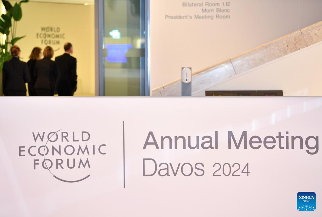 This photo taken on Jan. 14, 2024 shows a view of the media center for the World Economic Forum (WEF) Annual Meeting 2024 in Davos, Switzerland. On the theme of "Rebuilding Trust," the 54th WEF Annual Meeting will take place here from Jan. 15 to Jan. 19. The main topics at the forum range from achieving security and cooperation in a divided world, creating jobs and growth for a new era to a long-term strategy for climate, nature and energy. (Xinhua/Lian Yi)