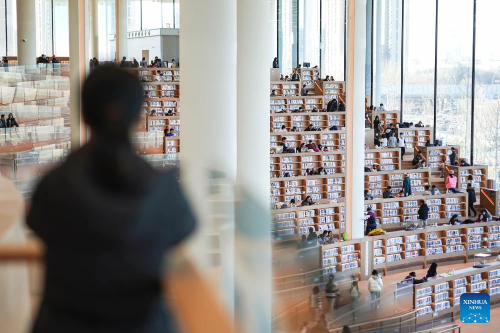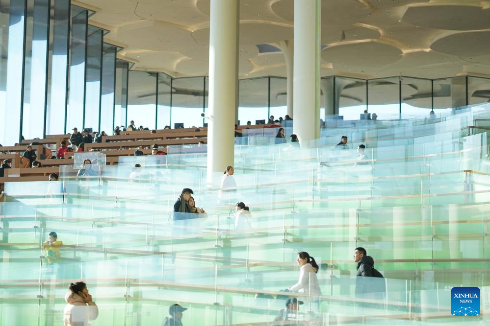 This photo taken on Jan. 14, 2024 shows an interior view of Beijing Library in Beijing, capital of China. Many citizens visited the recently opened library to spend their leisure time this weekend. (Xinhua/Peng Ziyang)