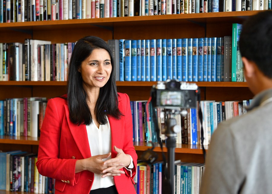 Saadia Zahidi, managing director of the World Economic Forum (WEF), speaks during an interview at the WEF headquarters in Geneva, Switzerland, on May 1, 2023. (Xinhua/Lian Yi)