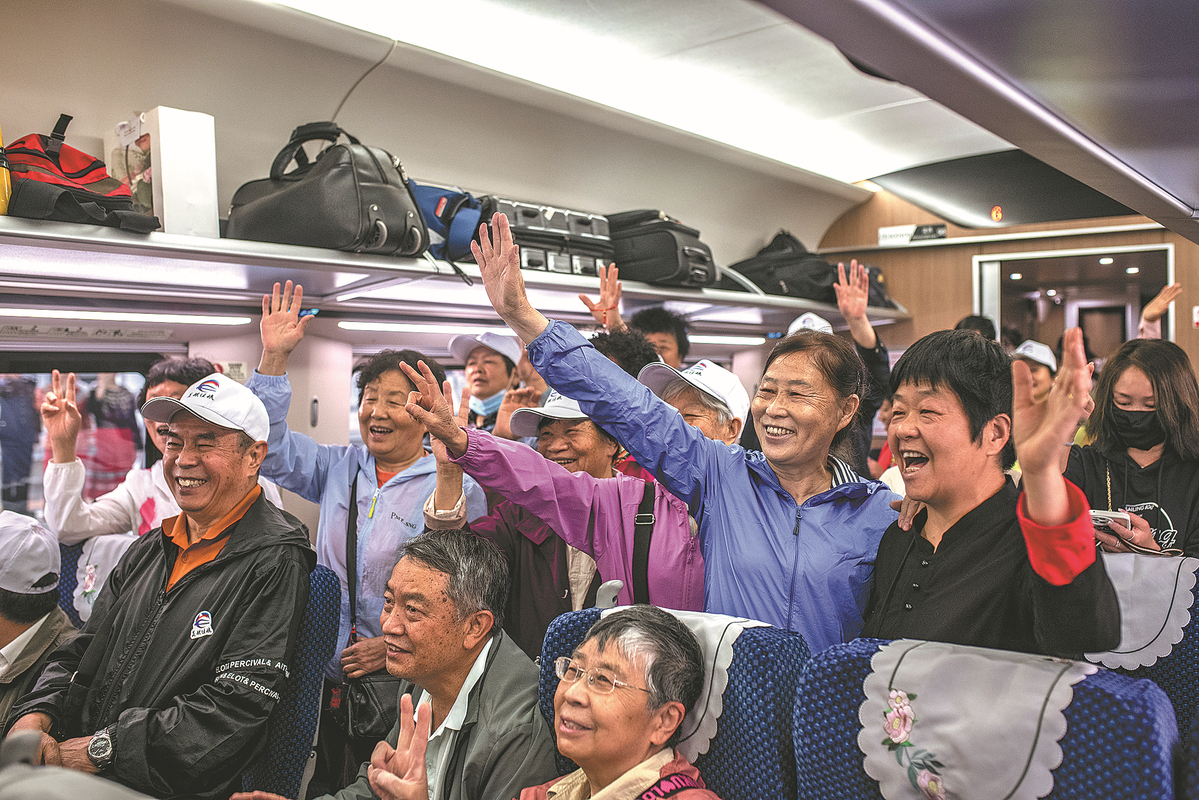 Passengers cheer during a trip on the China-Laos Railway in April. [HU CHAO/XINHUA]