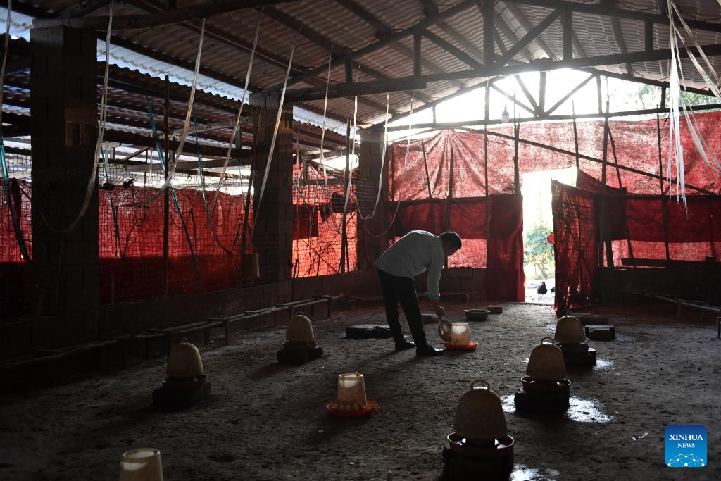 Guo Weixin, a member of the Shangshan Service Center for the Disabled, cleans a henhouse in Lianhuashan Village, Yuelu District of Changsha, central China's Hunan Province, Jan. 13, 2024. (Xinhua/Chen Zhenhai)