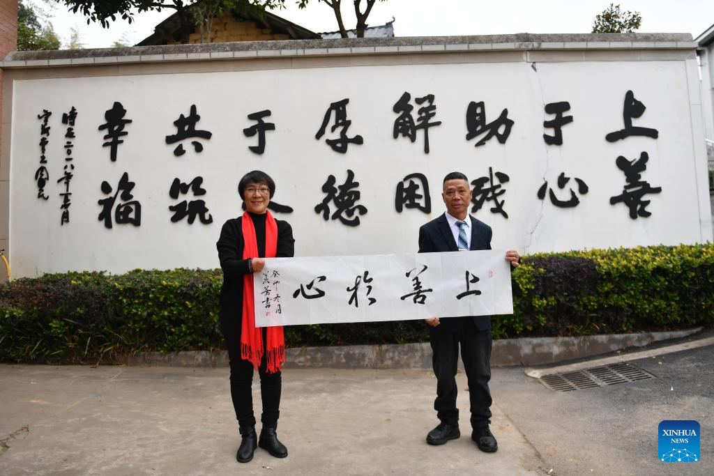 Xie Xiangqian (R) demonstrates an calligraphy work of Tan Huangfang (L), a member of the Shangshan Service Center for the Disabled, in Lianhuashan Village, Yuelu District of Changsha, central China's Hunan Province, Jan. 14, 2024. (Xinhua/Chen Zhenhai)