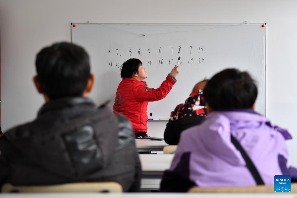 Jiang Wan (C), a member of the Shangshan Service Center for the Disabled, gives a lesson to people with disabilities in Lianhuashan Village, Yuelu District of Changsha, central China's Hunan Province, March 4, 2022. (Xinhua/Chen Zhenhai)