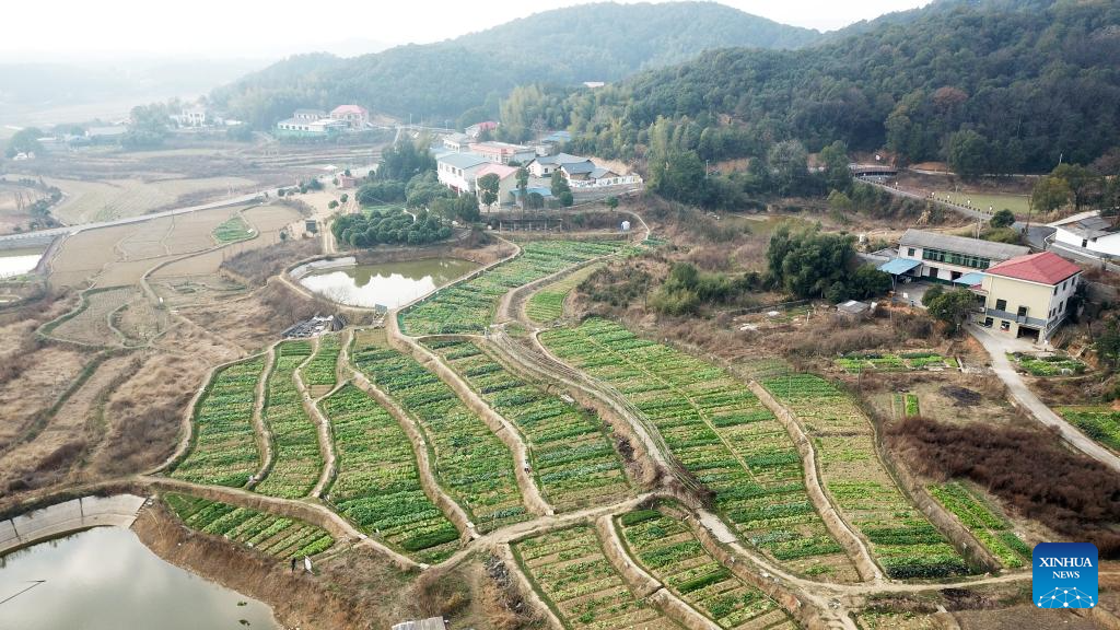An aerial drone photo taken on Jan. 13, 2024 shows a farmland of the Shangshan Service Center for the Disabled in Lianhuashan Village, Yuelu District of Changsha, central China's Hunan Province. (Xinhua/Chen Zhenhai)
