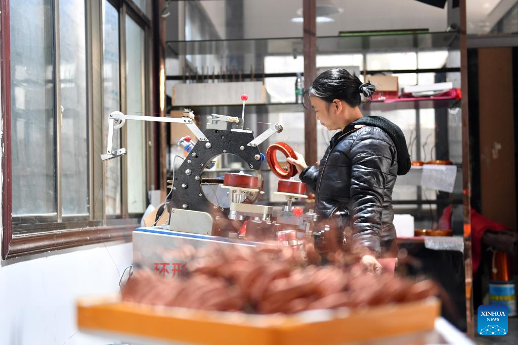 Qin Fang, a member of the Shangshan Service Center for the Disabled, processes coils at a workshop in Lianhuashan Village, Yuelu District of Changsha, central China's Hunan Province, Jan. 13, 2024. (Xinhua/Chen Zhenhai)
