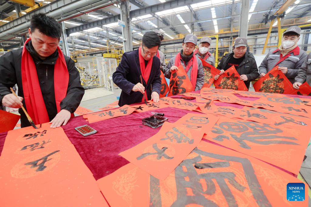Volunteer calligraphers write Spring Festival couplets for workers at a workshop in Huzhou City, east China's Zhejiang Province, Jan. 16, 2024. Various events are held across the country in celebration of the upcoming Chinese Lunar New Year, which falls on Feb. 10 this year. (Photo by Xie Shangguo/Xinhua)