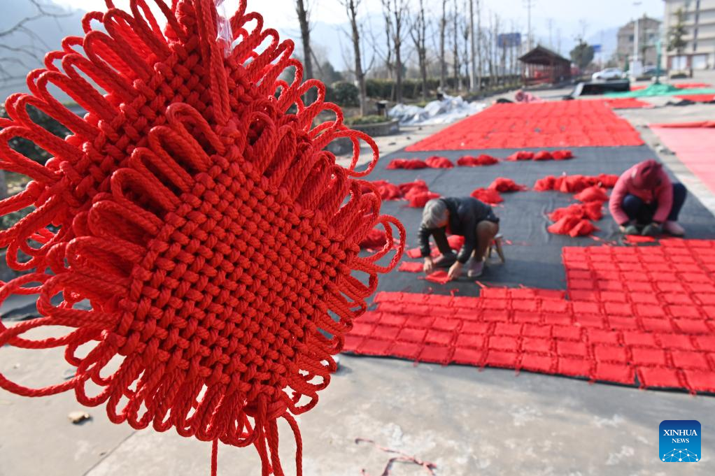 Villagers air newly made Chinese knots in Huanan Village of Huashui Town, Dongyang City, east China's Zhejiang Province, Jan. 16, 2024. Various events are held across the country in celebration of the upcoming Chinese Lunar New Year, which falls on Feb. 10 this year. (Photo by Bao Kangxuan/Xinhua)