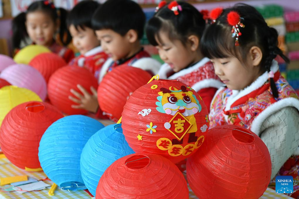 Children make lanterns at a kindergarten in Fushan District of Yantai, east China's Shandong Province, Jan. 16, 2024. Various events are held across the country in celebration of the upcoming Chinese Lunar New Year, which falls on Feb. 10 this year. (Photo by Sun Wentan/Xinhua)