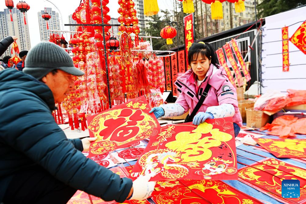 People buy decorations for the upcoming Spring Festival at a market in Shijiazhuang City, north China's Hebei Province, Jan. 16, 2024. Various events are held across the country in celebration of the upcoming Chinese Lunar New Year, which falls on Feb. 10 this year. (Photo by Chen Qibao/Xinhua)