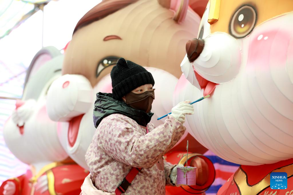 A worker colors festive lanterns in Hongze District of Huai'an in east China's Jiangsu Province, Jan. 16, 2024. Various events are held across the country in celebration of the upcoming Chinese Lunar New Year, which falls on Feb. 10 this year. (Photo by Yin Chao/Xinhua)