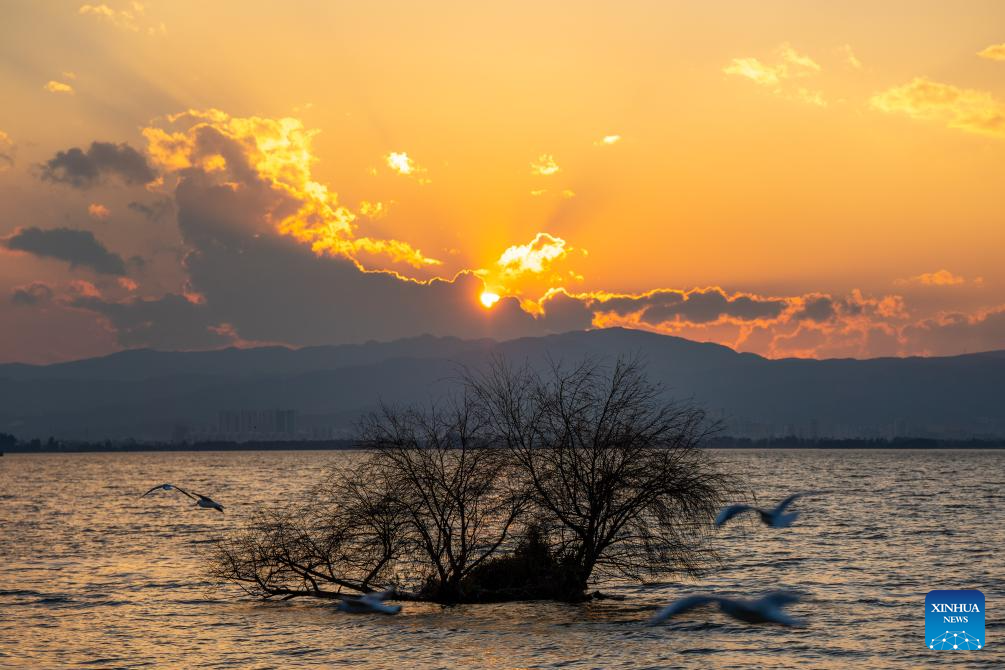 This photo taken on Jan. 13, 2024 shows a view of the Dianchi Lake in Kunming, southwest China's Yunnan Province. The overall water quality of Dianchi Lake has been maintained for six consecutive years since it reached Class IV in the country's five-tier evaluation system for the first time in 2018. (Xinhua/Hu Chao)