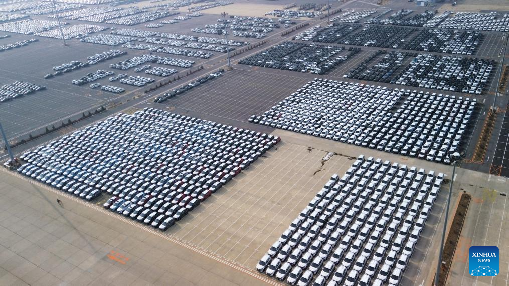 An aerial drone photo taken on Jan. 16, 2024 shows vehicles at a terminal of Dalian Port, northeast China's Liaoning Province. Dalian Port achieved a record-breaking annual export of 102,773 vehicles in 2023, marking a year-on-year growth of 143 percent, according to the Dalian Customs. (Xinhua/Chen Wei)