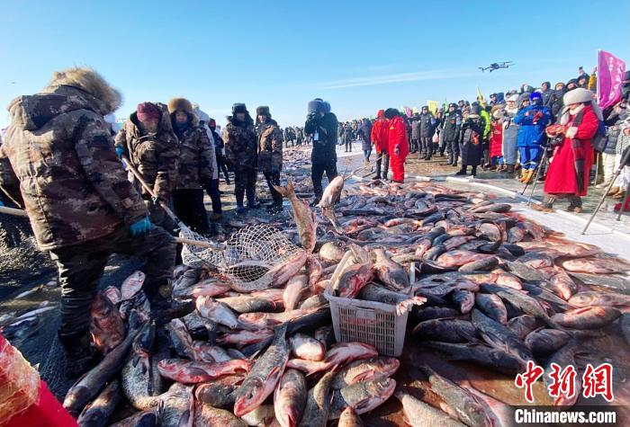 Photo shows freshly caught fish at the winter fishing-themed festival at Xingkai Lake in Jixi city, northeast China's Heilongjiang Province. (Photo/Wang Nina)