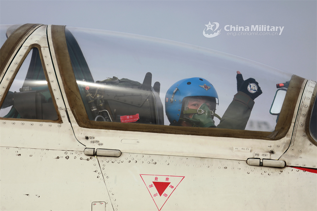 A cadet pilot assigned to a regiment of the PLA Naval Aviation University gives a thumbs-up sign in the cockpit before taxiing out for a flight training exercise in early January, 2024. (eng.chinamil.com.cn/Photo by Lan Pengfei, Lu Xinqian and Xu Kangyu)