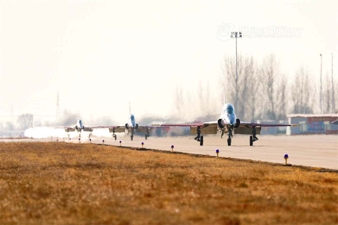 Jet trainers attached to a regiment of the PLA Naval Aviation University taxi on the runway in formation before takeoff during a flight training exercise in early January, 2024. (eng.chinamil.com.cn/Photo by Lan Pengfei, Lu Xinqian and Xu Kangyu)